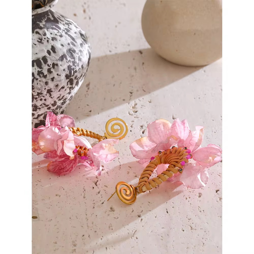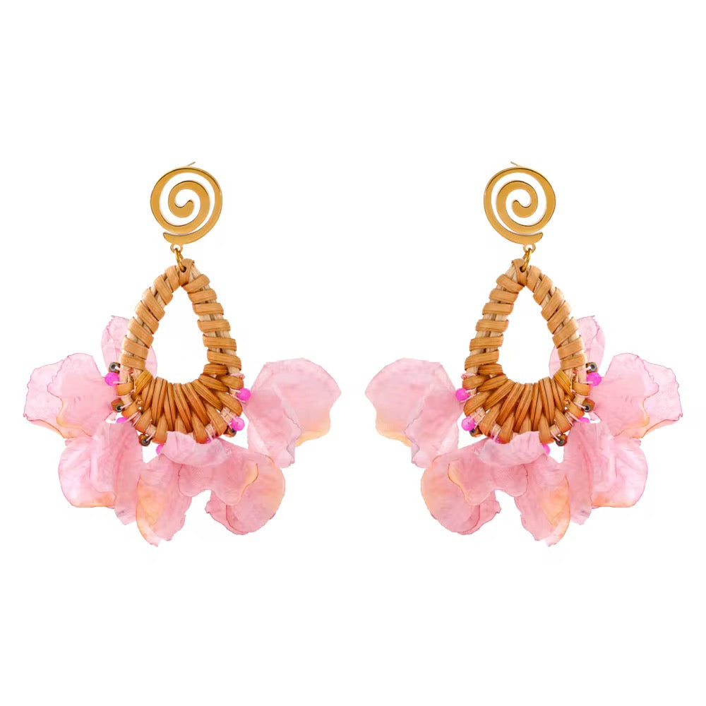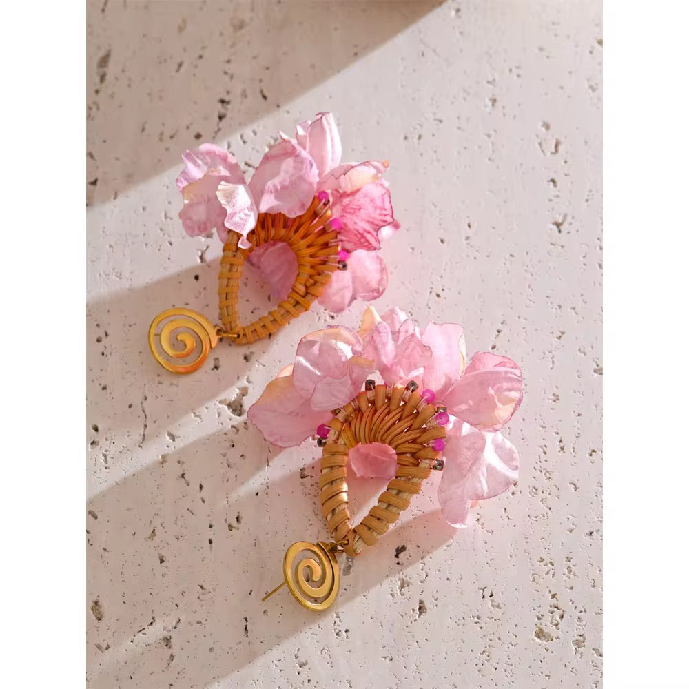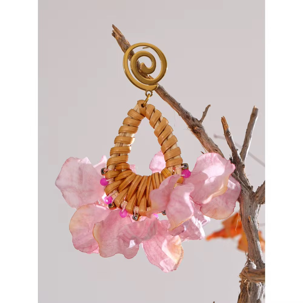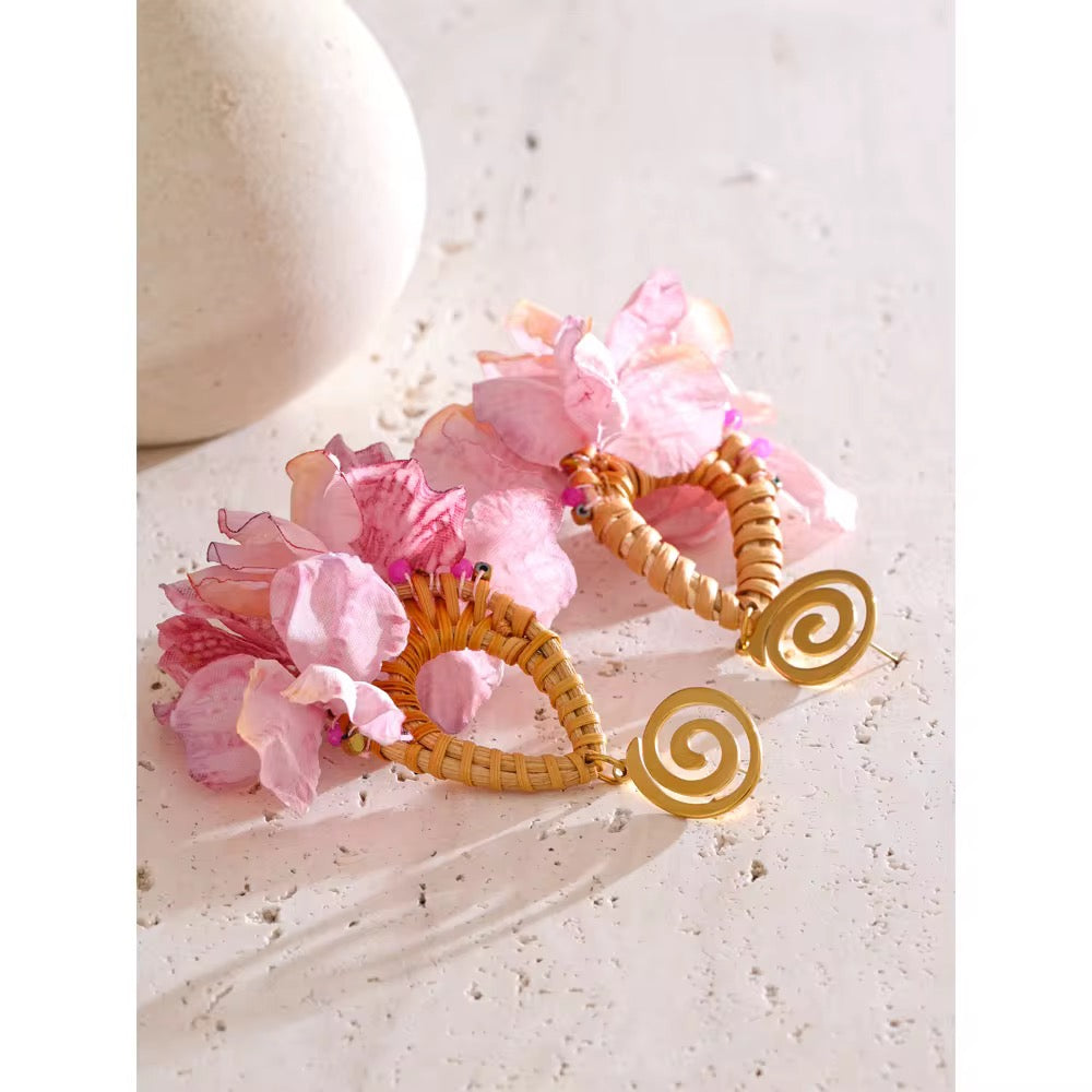 Handmade with natural rattan and delicate fabric petals, this floral-inspired earring features vibrant pink beads and a bold gold-tone spiral top. Finished with 18k gold-plated stainless steel for lasting shine. Lightweight, eye-catching, and perfect for sunny escapes.