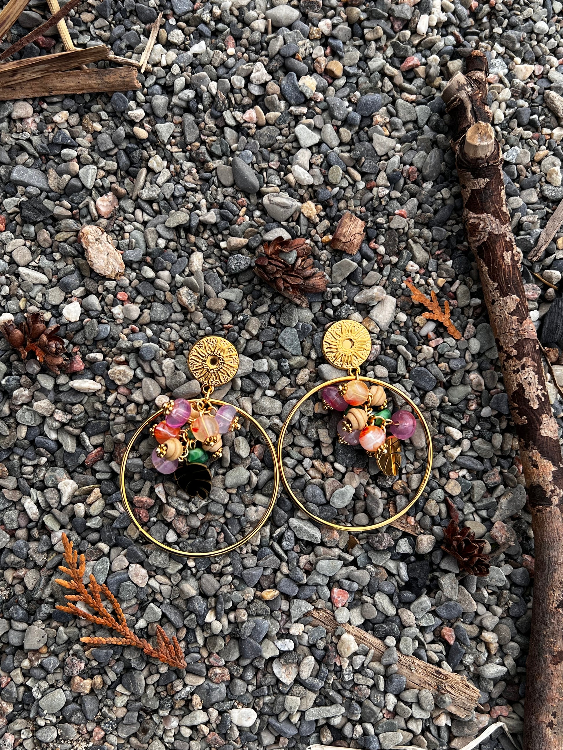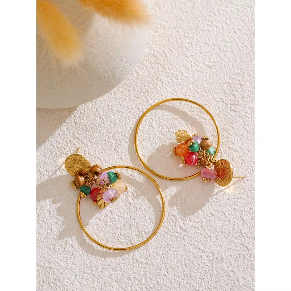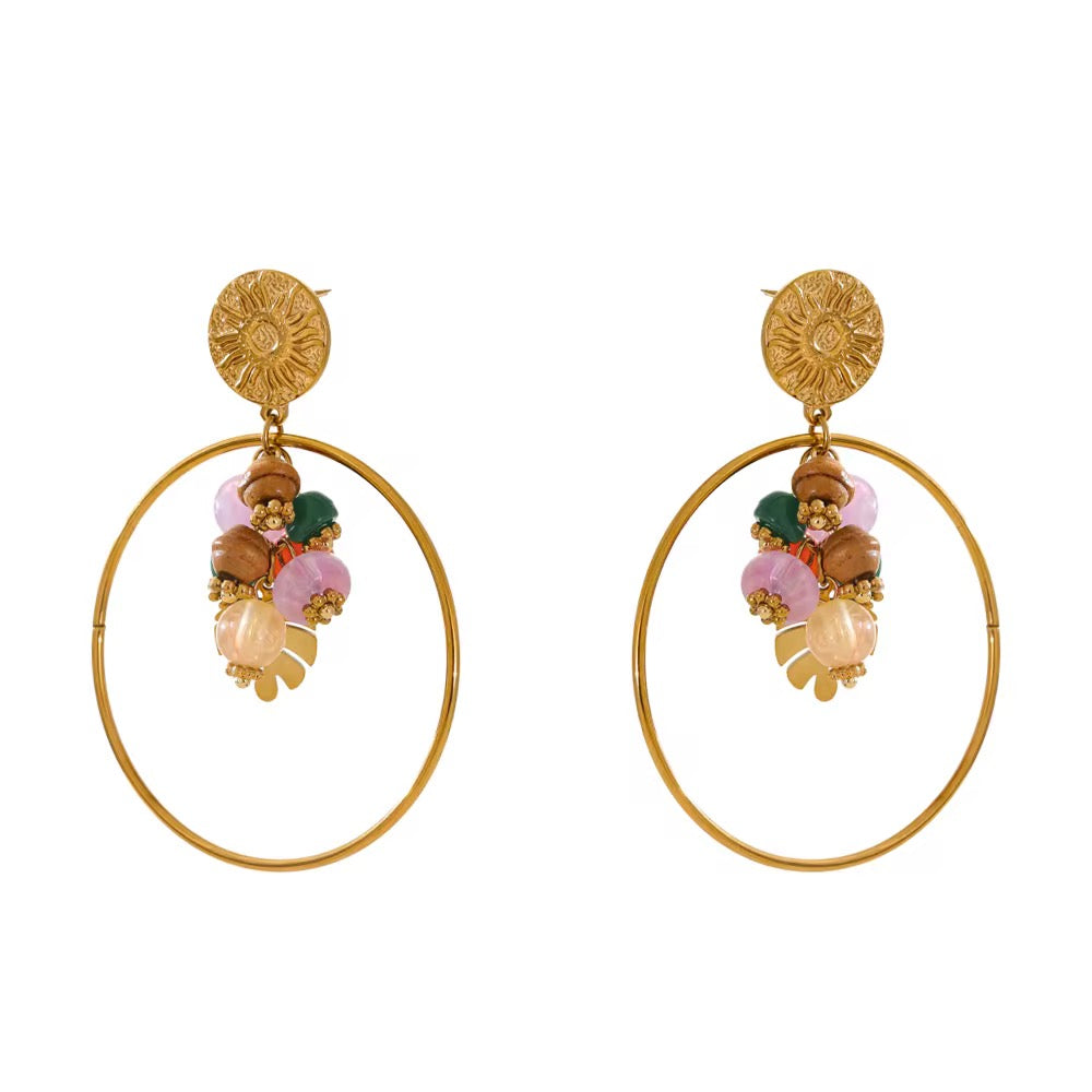 Inspired by sunlit gardens, these playful hoops feature pastel-toned beads and golden details, centered with a radiant sun medallion. Made with 18k gold-plated stainless steel, they’re tarnish-free, waterproof, and light as air for all-day wear.